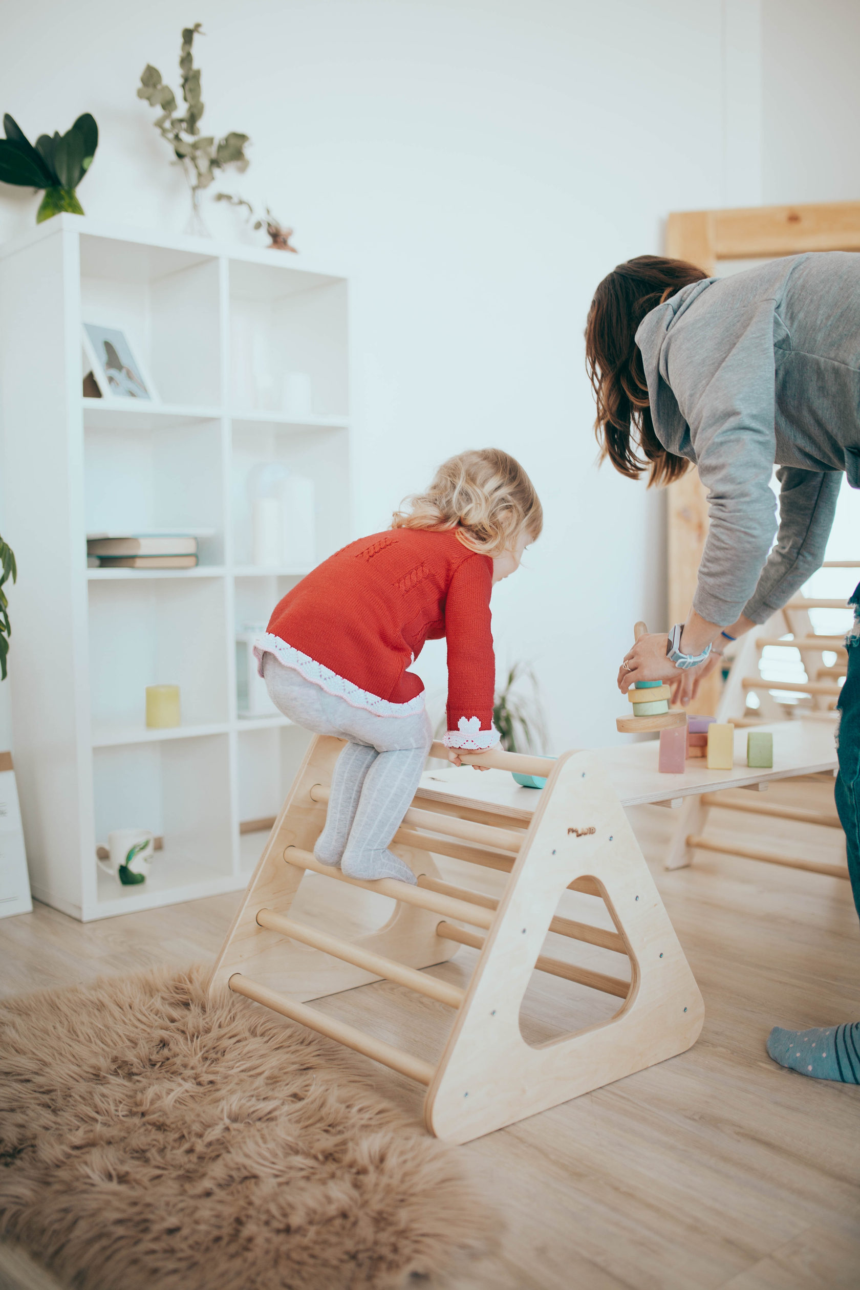 Горка для скалолазания самый любимый детьми предмет из всего развивающего комплекса. Угол наклона можно отрегулировать в зависимости от способностей и смелости ребенка, а также выбрать гладкую сторону или сторону с перекладинами.